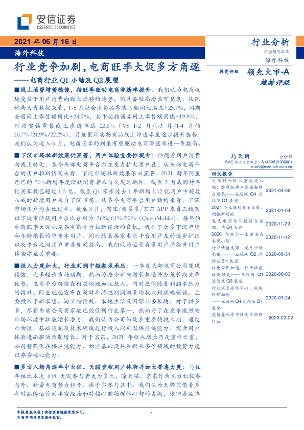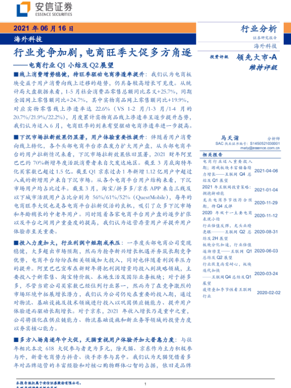 【安信证券】【20210616】电商行业Q1小结及Q2展望:行业竞争加剧,电商旺季大促多方角逐-17页