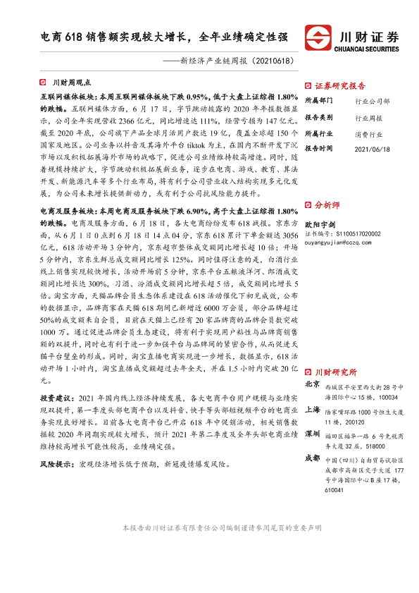 【川财证券】【20210618】新经济产业链周报:电商618销售额实现较大增长,全年业绩确定性强-12页