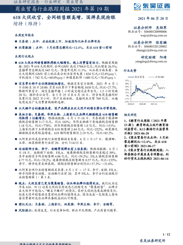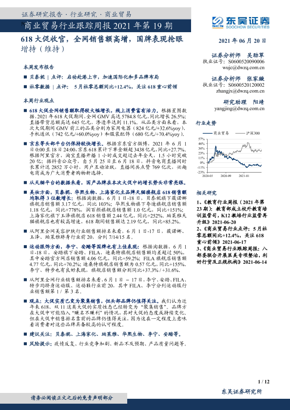 【东吴证券】【20210620】商业贸易行业跟踪周报2021年第19期:618大促收官,全网销售额高增,国牌表现抢眼-12页