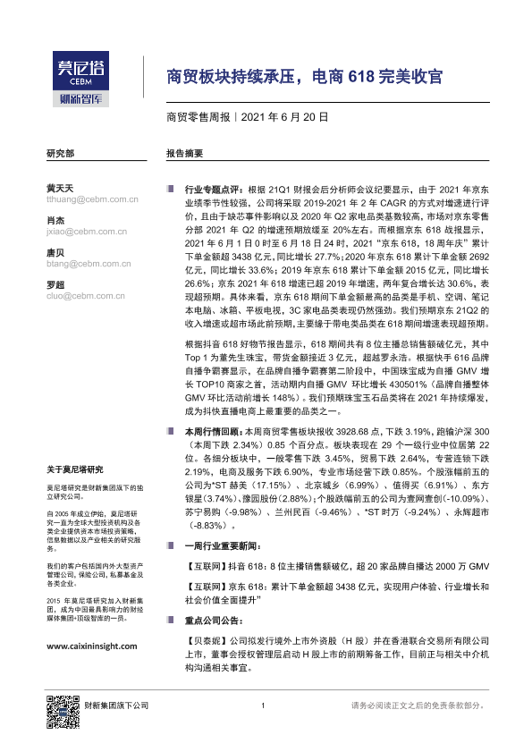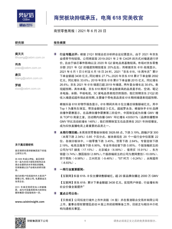 【莫尼塔研究】【20210620】商贸零售周报:商贸板块持续承压,电商618完美收官-7页