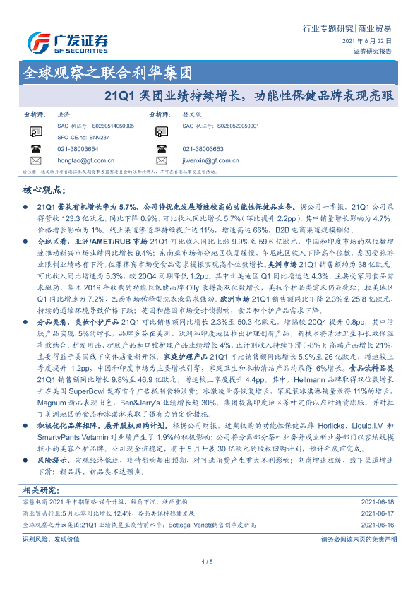 【广发证券】【20210622】21Q1集团业绩持续增长,功能性保健品牌表现亮眼-5页