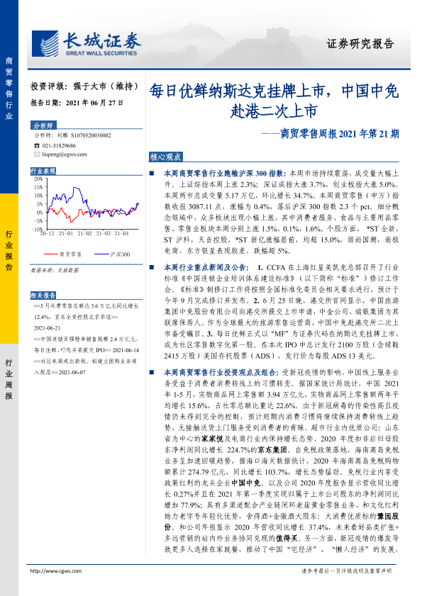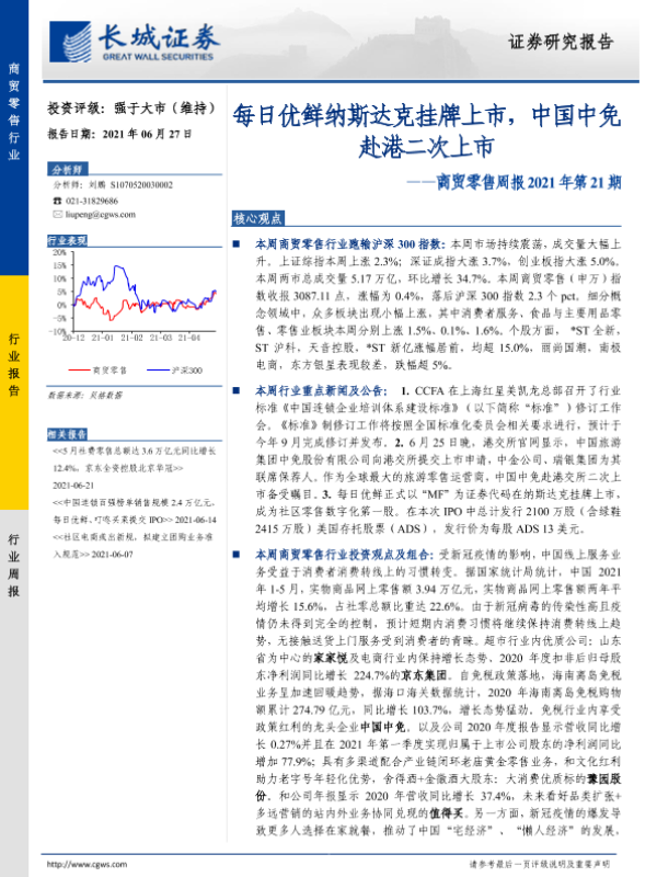 【长城证券】【20210627】商贸零售周报2021年第21期:每日优鲜纳斯达克挂牌上市,中国中免赴港二次上市-10页