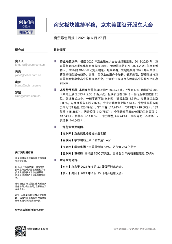 【莫尼塔研究】【20210627】商贸零售周报:商贸板块维持平稳,京东美团召开股东大会-7页