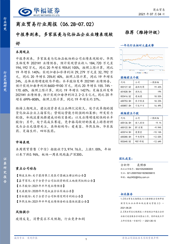 【华福证券】【20210704】商业贸易行业周报:中报季到来,多家医美与化妆品企业业绩表现较好-7页