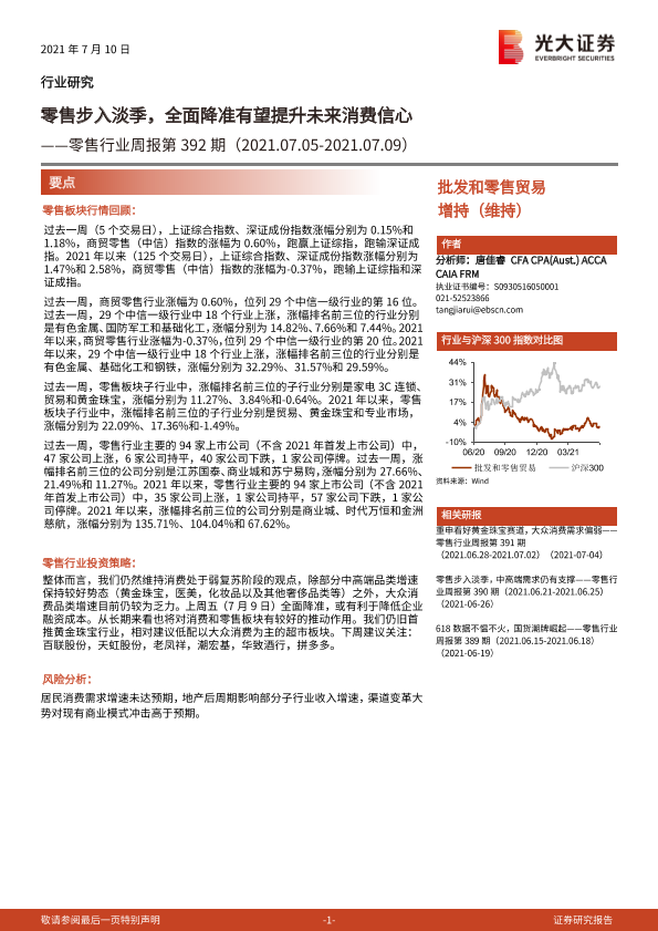 【光大证券】【20210710】零售行业周报第392期:零售步入淡季,全面降准有望提升未来消费信心-8页