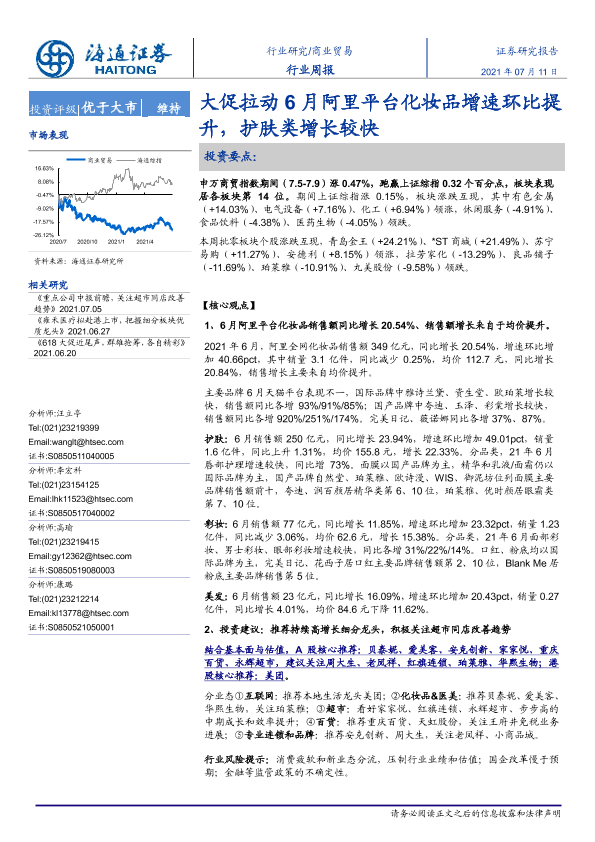 【海通证券】【20210711】大促拉动6月阿里平台化妆品增速环比提升,护肤类增长较快-8页