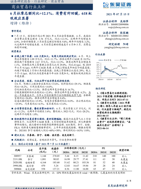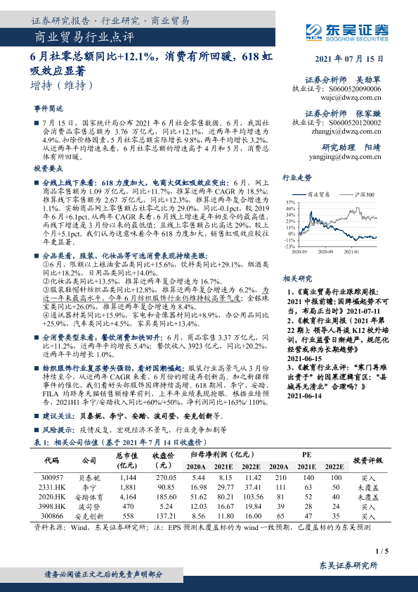 【东吴证券】【20210715】商业贸易行业点评:6月社零总额同比+12.1%,消费有所回暖,618虹吸效应显著-5页