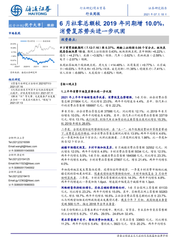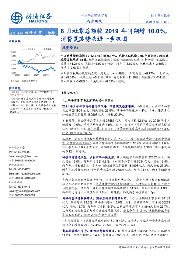 【海通证券】【20210718】6月社零总额较2019年同期增10.0%,消费复苏势头进一步巩固-6页
