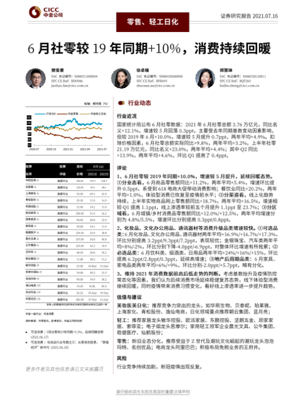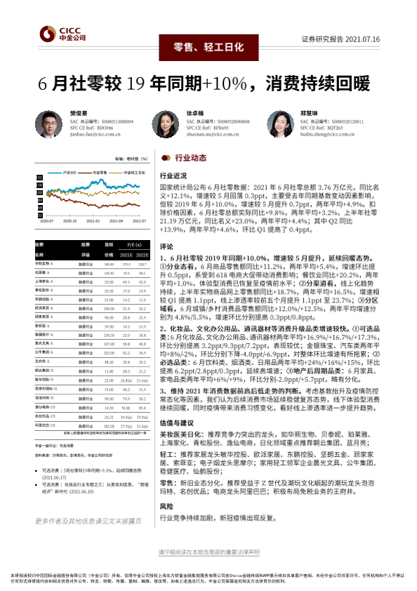 【中金公司】【20210716】零售、轻工日化:6月社零较19年同期+10%,消费持续回暖-11页