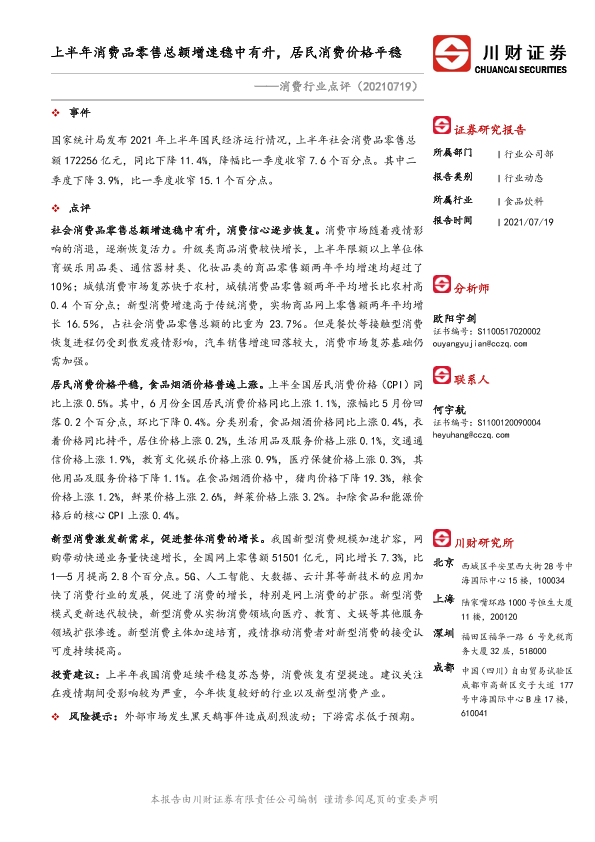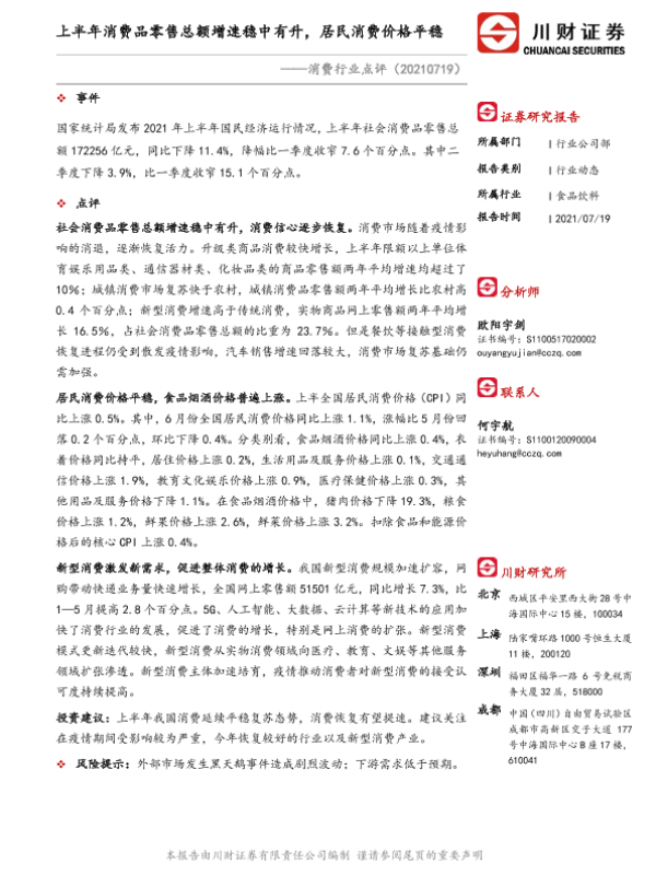 【川财证券】【20210719】消费行业点评:上半年消费品零售总额增速稳中有升,居民消费价格平稳-2页