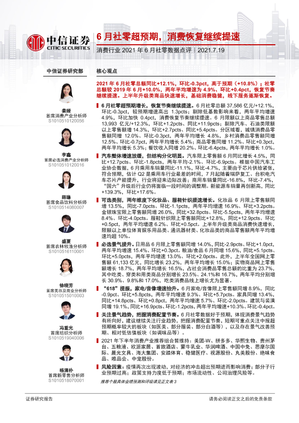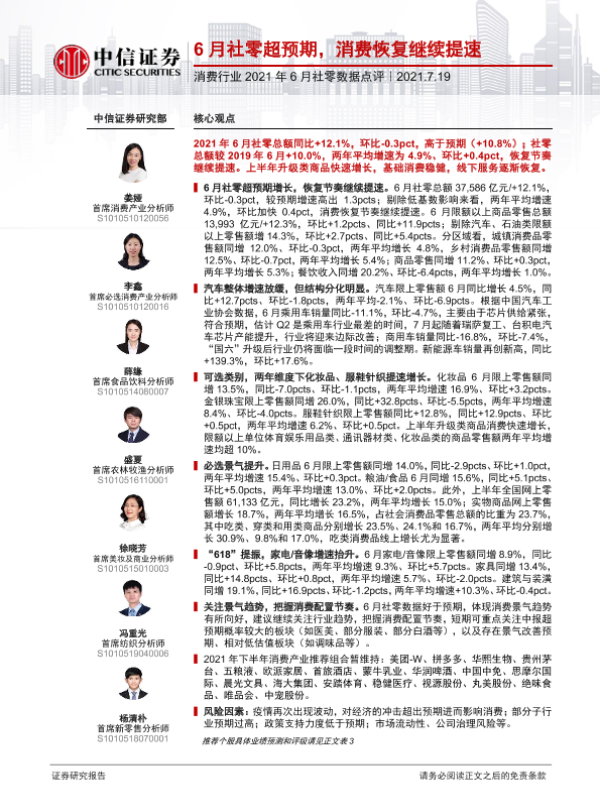 【中信证券】【20210719】2021年6月社零数据点评:6月社零超预期,消费恢复继续提速-6页