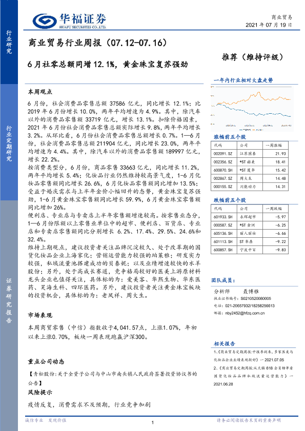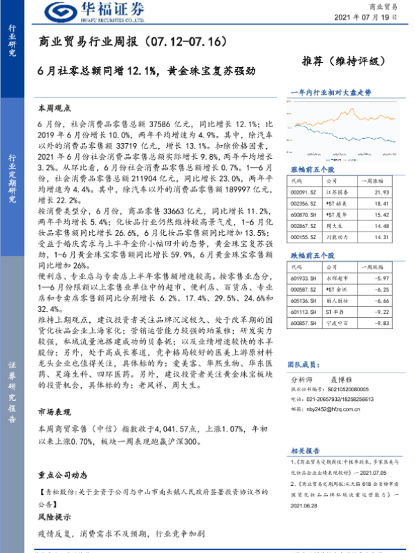 【华福证券】【20210719】商业贸易行业周报:6月社零总额同增12.1%,黄金珠宝复苏强劲-7页