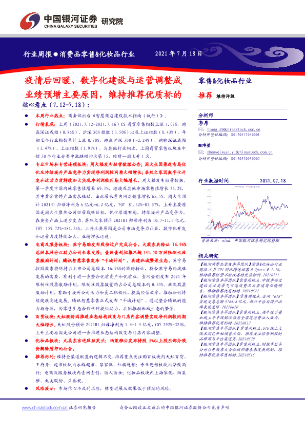 【银河证券】【20210718】消费品零售&化妆品行业周报:疫情后回暖、数字化建设与运营调整成业绩预增主要原因,维持推荐优质标的-32页