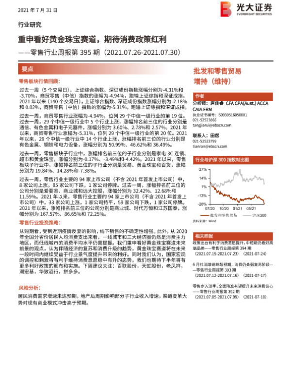 【光大证券】【20210731】零售行业周报第395期:重申看好黄金珠宝赛道,期待消费政策红利-8页
