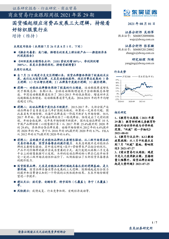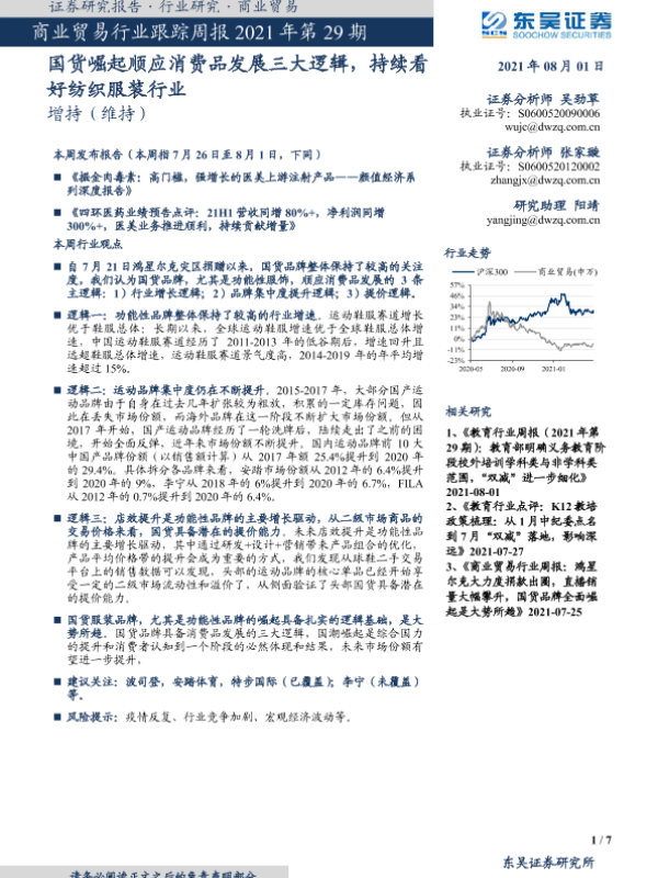 【东吴证券】【20210801】商业贸易行业跟踪周报2021年第29期:国货崛起顺应消费品发展三大逻辑,持续看好纺织服装行业-7页