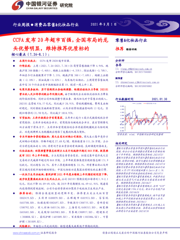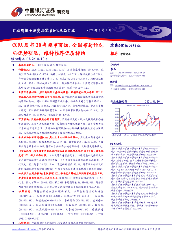 【银河证券】【20210801】CCFA发布20年超市百强,全国布局的龙头优势明显,维持推荐优质标的-33页