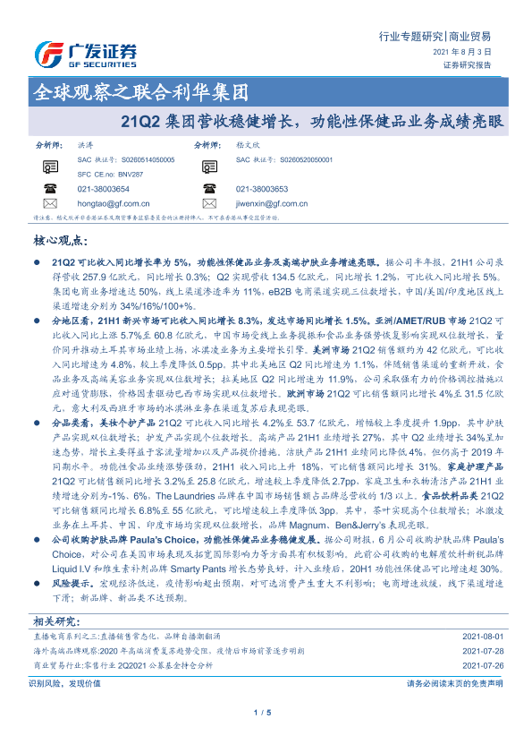 【广发证券】【20210803】全球观察之联合利华集团:21Q2集团营收稳健增长,功能性保健品业务成绩亮眼-5页