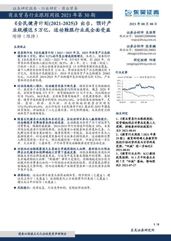 【东吴证券】【20210808】商业贸易行业跟踪周报2021年第30期:《全民健身计划(2021-2025)》出台,预计产业规模达5万亿,运动鞋服行业或全面受益-8页