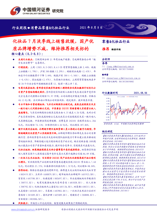 【银河证券】【20210808】消费品零售&化妆品行业周报:化妆品7月淡季线上销售放缓,国产优质品牌增势不减,维持推荐相关标的-34页