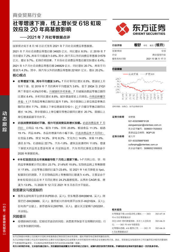 【东方证券】【20210817】2021年7月社零数据点评:社零增速下滑,线上增长受618虹吸效应及20年高基数影响-7页