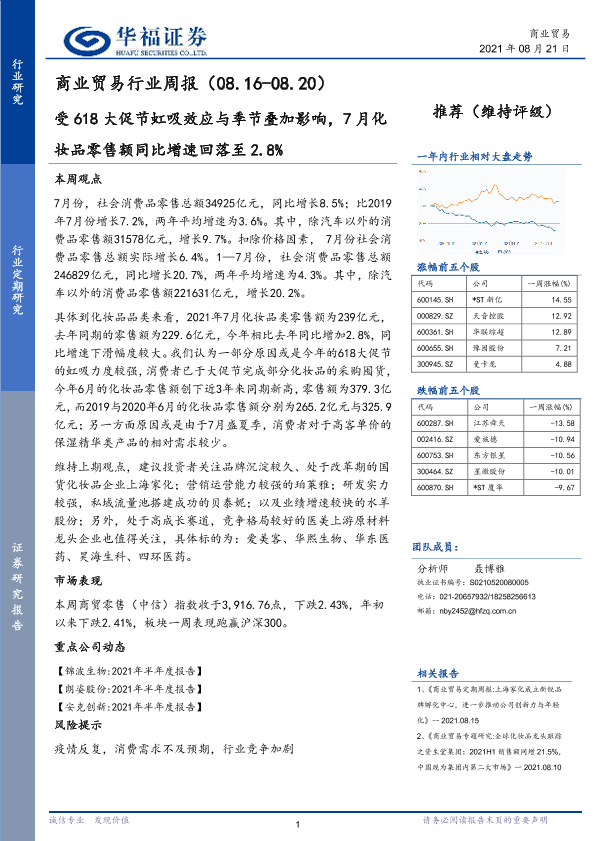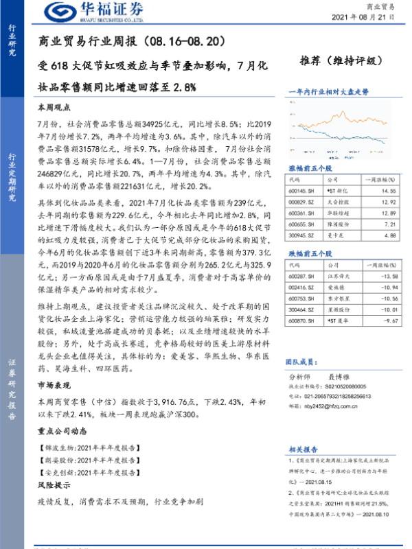 【华福证券】【20210821】商业贸易行业周报:受618大促节虹吸效应与季节叠加影响,7月化妆品零售额同比增速回落至2.8%-8页