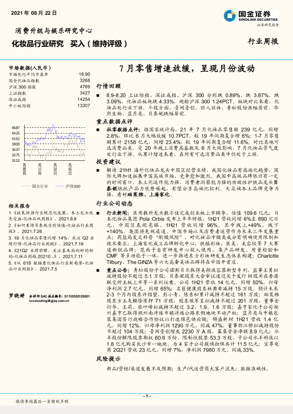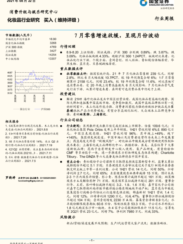 【国金证券】【20210822】化妆品行业研究周报:7月零售增速放缓,呈现月份波动-14页