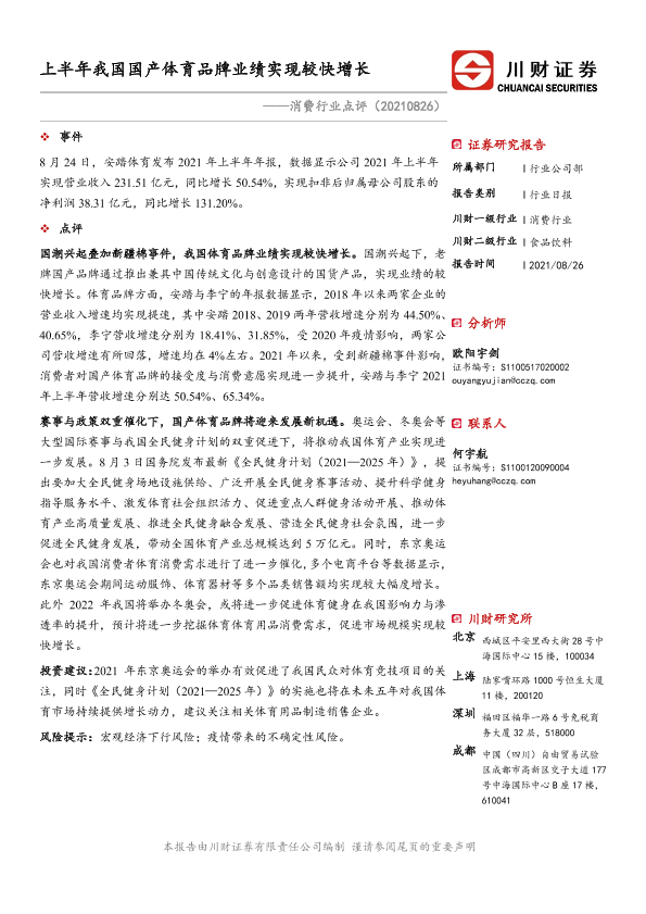 【川财证券】【20210826】消费行业点评:上半年我国国产体育品牌业绩实现较快增长-2页