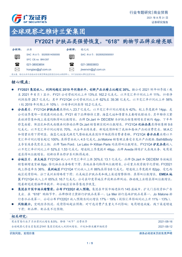 【广发证券】【20210831】雅诗兰黛集团:FY2021护肤品类强势恢复,“618”购物节品牌业绩亮眼-5页