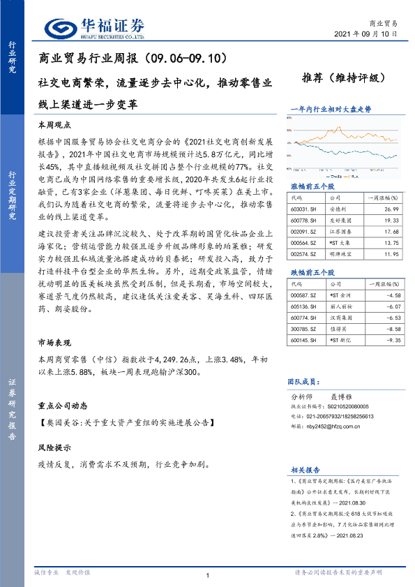 【华福证券】【20210910】商业贸易行业周报:社交电商繁荣,流量逐步去中心化,推动零售业线上渠道进一步变革-6页