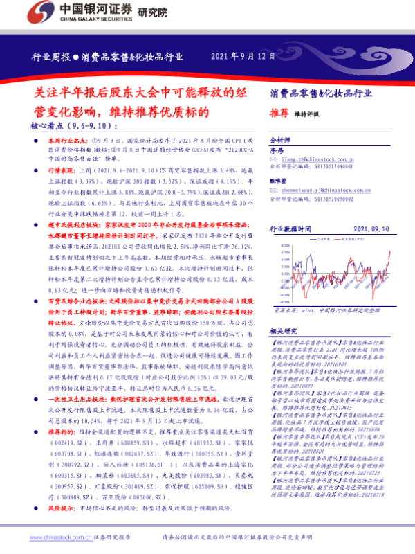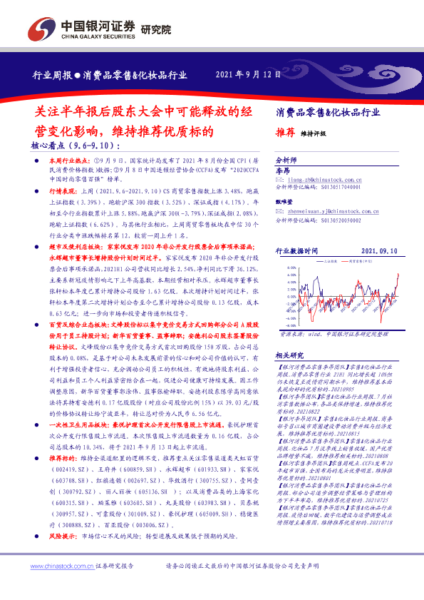 【银河证券】【20210912】消费品零售&化妆品行业周报:关注半年报后股东大会中可能释放的经营变化影响-33页