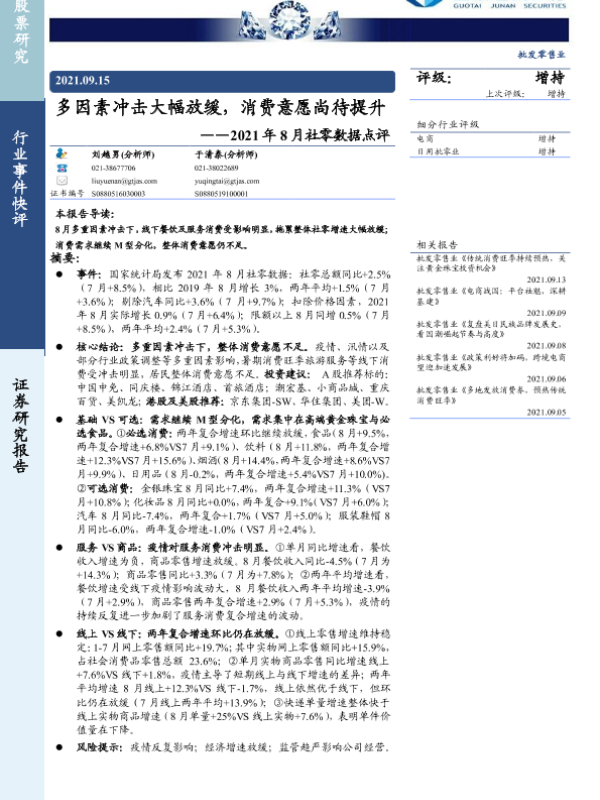 【国泰君安证券】【20210915】2021年8月社零数据点评:多因素冲击大幅放缓,消费意愿尚待提升-8页