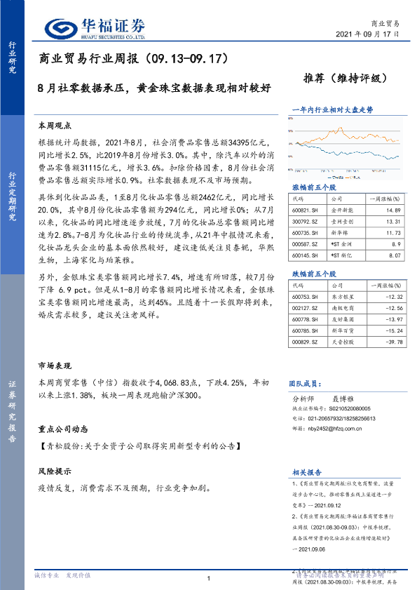 【华福证券】【20210917】商业贸易行业周报:8月社零数据承压,黄金珠宝数据表现相对较好-7页