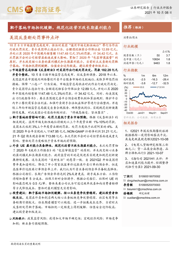 【海通证券】【20211008】美团反垄断处罚事件点评:靴子落地市场担忧缓解,规范化运营不改长期盈利能力-2页