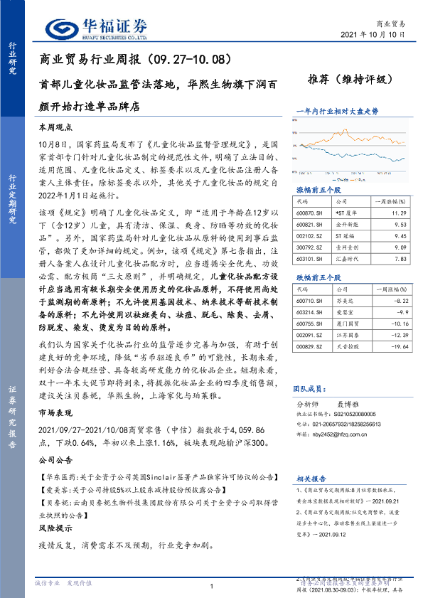 【华福证券】【20211010】商业贸易行业周报:首部儿童化妆品监管法落地,华熙生物旗下润百颜开始打造单品牌店-7页