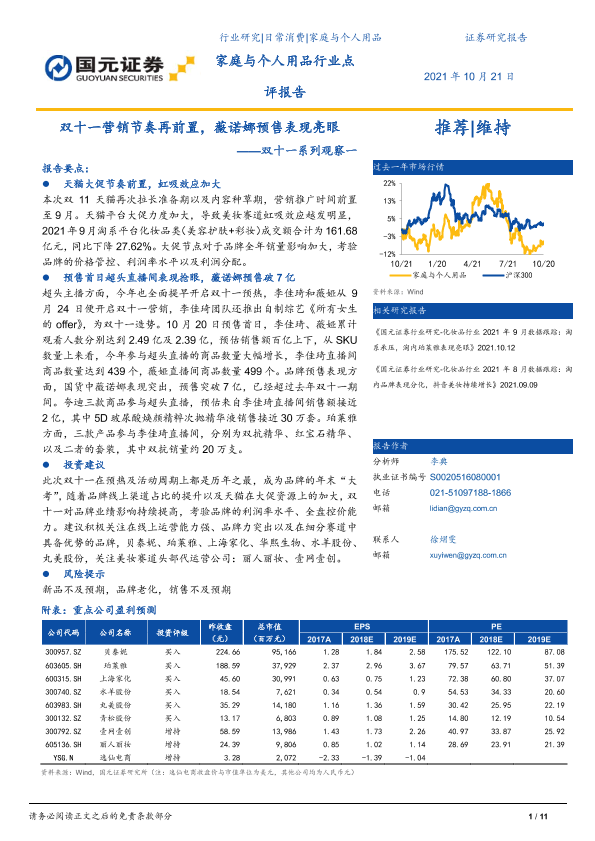 【国元证券】【20211021】双十一系列观察一-双十一营销节奏再前置,薇诺娜预售表现亮眼-11页