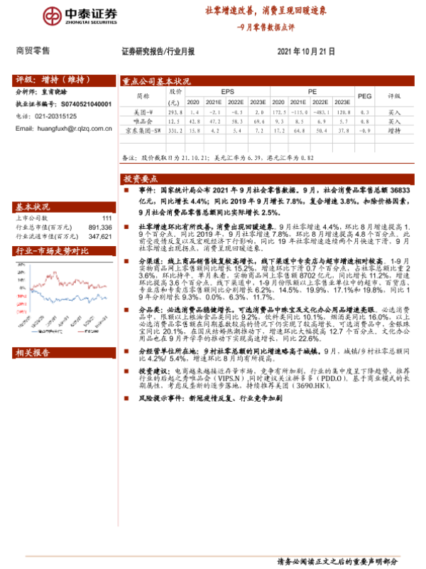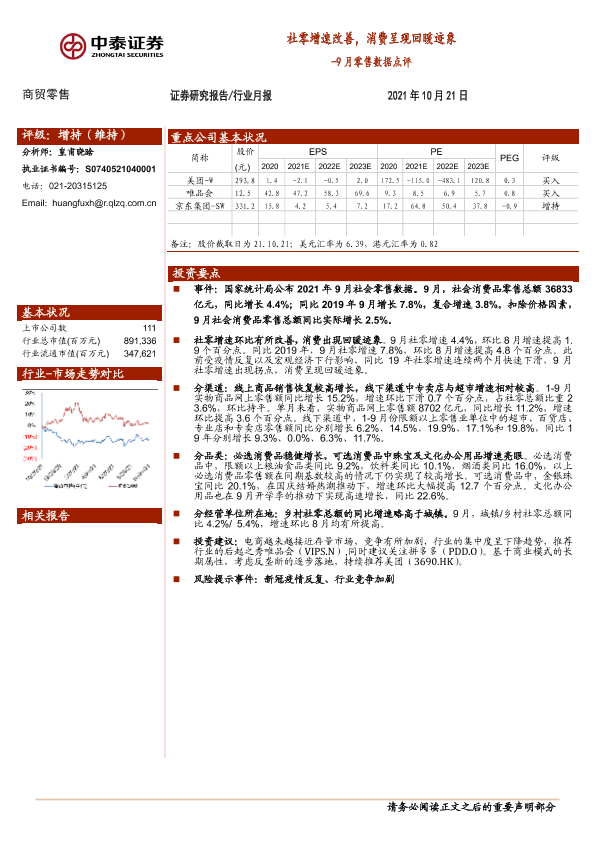 【中泰证券】【20211021】9月零售数据点评:社零增速改善,消费呈现回暖迹象-6页
