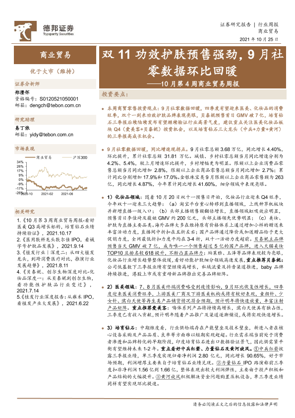 【德邦证券】【20211025】10月第4周商业贸易周报:双11功效护肤预售强劲,9月社零数据环比回暖-18页