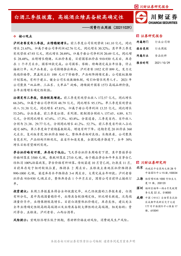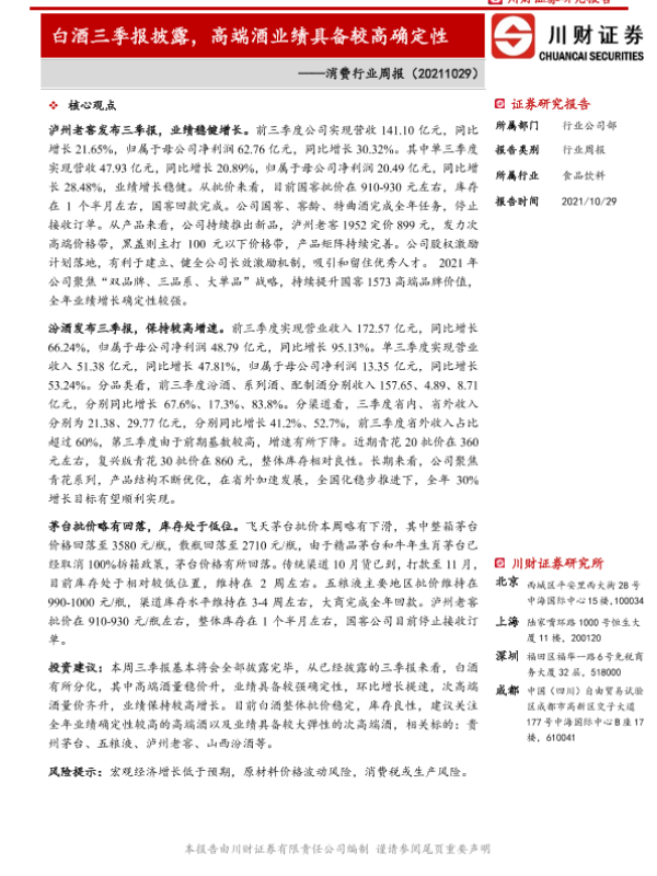 【川财证券】【20211029】消费行业周报:白酒三季报披露,高端酒业绩具备较高确定性-16页
