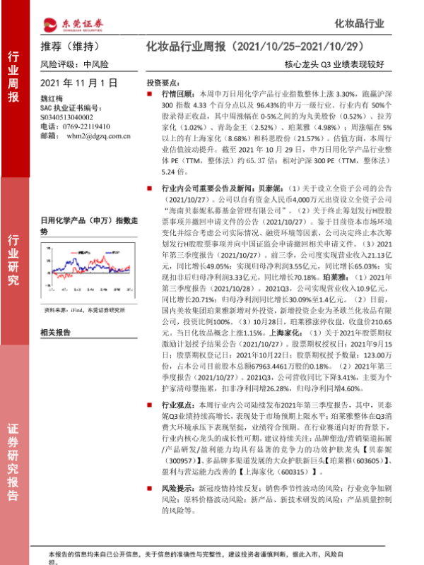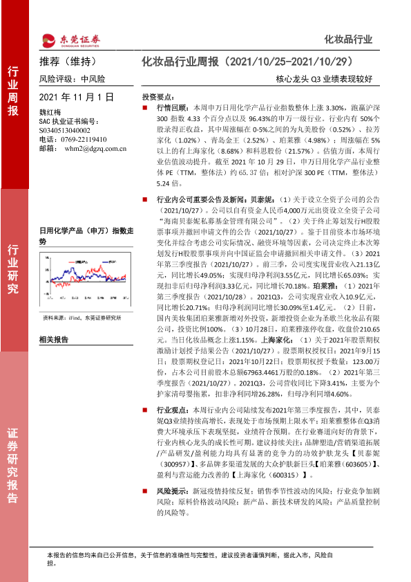 【东莞证券】【20211101】化妆品行业周报:核心龙头Q3业绩表现较好-10页