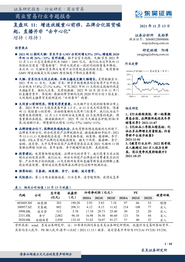 【东吴证券】【20211113】商业贸易行业专题报告:复盘双11:增速放缓重心前移,品牌分化国货崛起,直播并非“去中心化”-10页