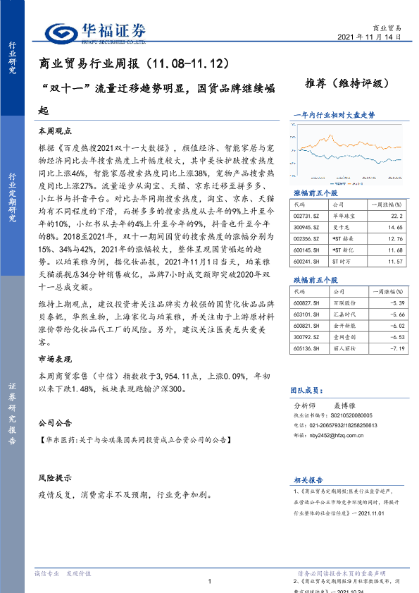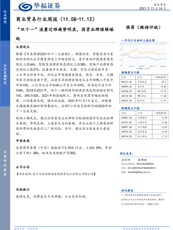 【华福证券】【20211114】商业贸易行业周报:“双十一”流量迁移趋势明显,国货品牌继续崛起-6页