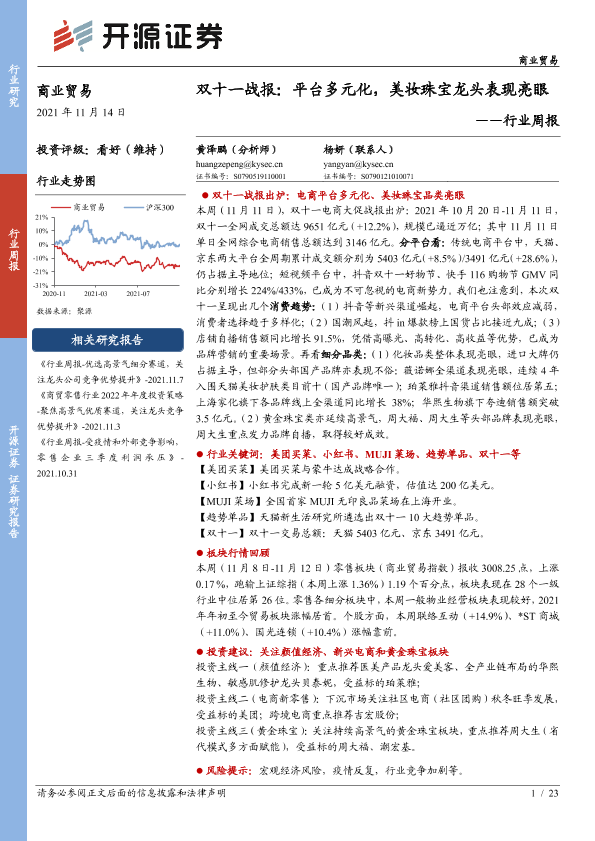 【开源证券】【20211114】商业贸易行业周报:双十一战报:平台多元化,美妆珠宝龙头表现亮眼-23页