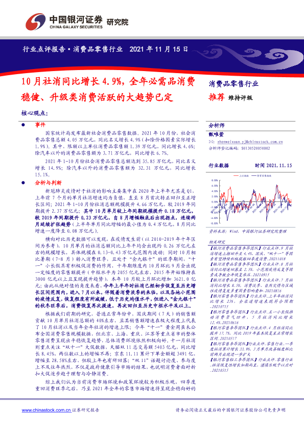 【银河证券】【20211115】10月社消同比增长4.9%,全年必需品消费稳健、升级类消费活跃的大趋势已定-6页