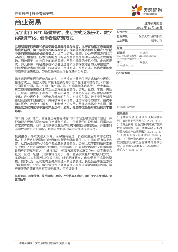 【天风证券】【20211118】商业贸易行业专题研究:元宇宙和NFT场景探讨:生活方式泛娱乐化、数字内容资产化、创作者经济新范式-11页
