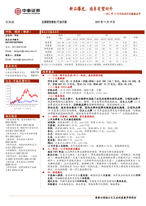 【中泰证券】【20211119】2021年10月化妆品行业数据点评:新品爆发,淘系有望回升-13页