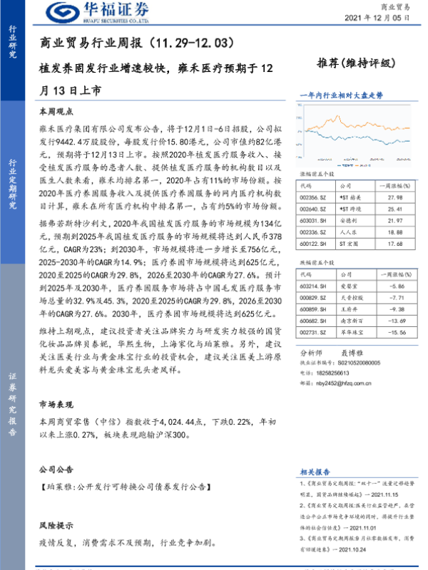 上市信息 商业贸易 市场规模 植发行业 雍禾医疗