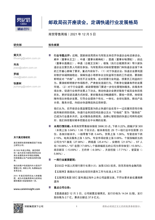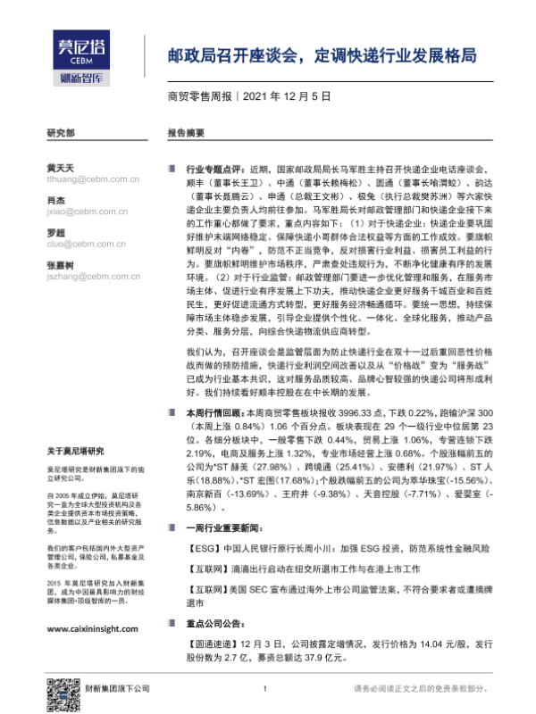 【莫尼塔研究】【20211205】商贸零售周报:邮政局召开座谈会,定调快递行业发展格局-7页