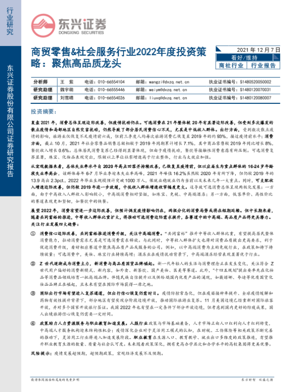 【东兴证券】【20211207】商贸零售&社会服务行业2022年度投资策略:聚焦高品质龙头-26页