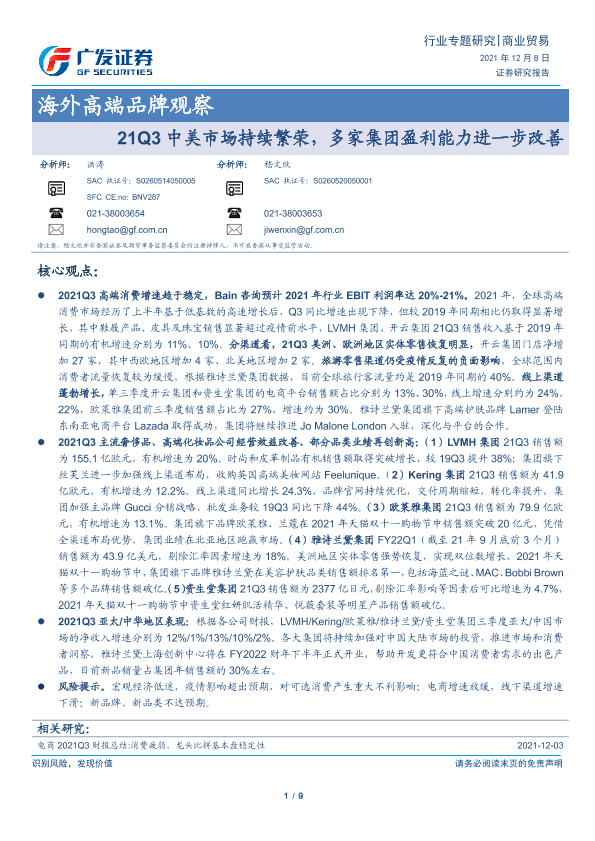 【广发证券】【20211208】海外高端品牌观察:21Q3中美市场持续繁荣,多家集团盈利能力进一步改善-9页