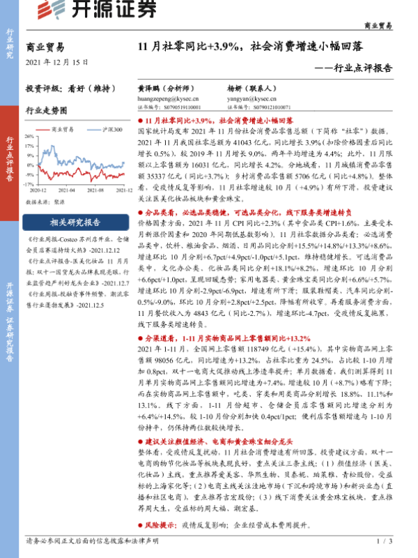 【开源证券】【20211215】11月社零同比+3.9%,社会消费增速小幅回落-3页